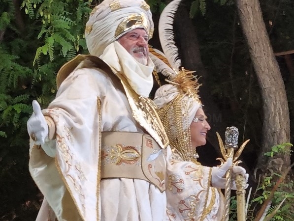 Y de tanto en tanto algunas carrozas de raras formas y colores sobre las que saludan los abanderados, embajadores, festero del año, reyes moros e infantes cristianos con sus más elegantes galas y también grupos de caballos y caballistas que hacen extraordinarias piruetas directas e inversas, pasos de costado, reverencias, posadas o los más complicados passage o piaffe. Y entre unos y otros, cientos de músicos formando bandas que con frecuencia han llegado de fuera de la ciudad e interpretando con sus trompetas, clarines y tambores música festera que incluye la marcha mora y la cristiana, pasodobles e incluso alguna atrevida versión de “La saeta” que levantaría de su tumba a Machado o haría temblar a Joan Manuel Serrat o la “marcha mora” We Will Rock You de Queen.
