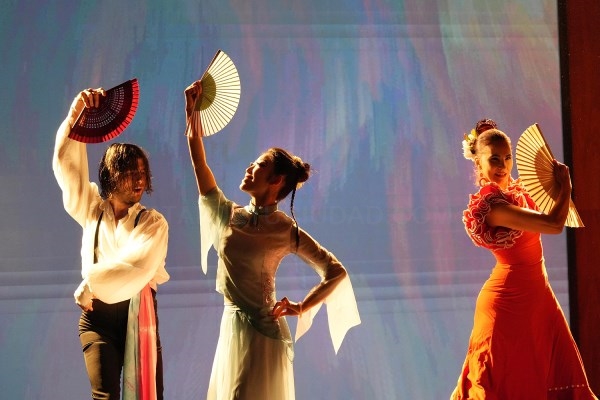 Los asistentes disfrutaron del vídeo promocional “Jiangsu, el Encanto del Agua”, compuesto por tres capítulos —“Armonía del Agua”, “Huella del Agua” y “Tierra de Agua”—, que ofrecieron una experiencia inmersiva sobre la relación entre el agua, la naturaleza y la cultura de Jiangsu. A continuación, artistas chinos y españoles interpretaron conjuntamente la danza “El abanico de la amistad”, una fusión entre la danza tradicional del sur de China y el flamenco, símbolo de diálogo y convivencia entre las dos culturas. El acto concluyó con una ceremonia artística en la que los invitados pintaron juntos un mural de puntos de color, marcando la apertura oficial de la exposición “Tejiendo el Agua en Seda: Elegancia Oriental”.